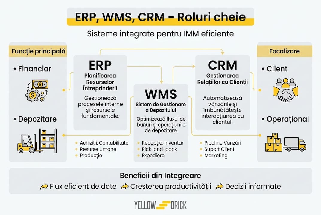 Conform analizelor comparative WMS vs ERP, cele două sisteme nu se exclud, ci se completează: ERP-ul oferă perspectiva macro, WMS-ul aduce detaliul micro-operațional, iar integrarea dintre ele este esențială pentru scalabilitatea unui IMM în creștere.