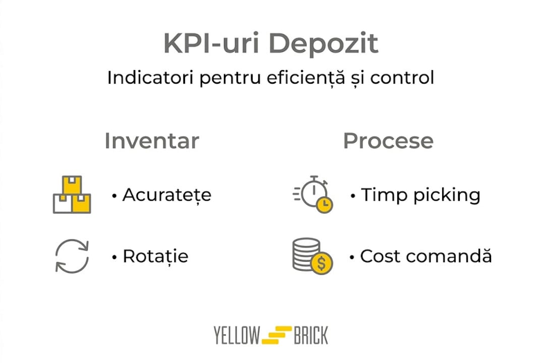 Cei mai importanți KPI sunt acuratețea inventarului, timpul de picking per linie, costul per comandă și rata de eroare la expediere, indicatori pe care slotting și WMS îi îmbunătățesc direct și măsurabil.